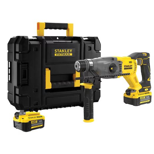 Tassellatore STANLEY FATMAX V20 18V con motore brushless, attacco SDS Plus e batteria da 4,0Ah, ideale per lavori professionali di foratura e tassellatura.
